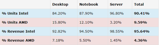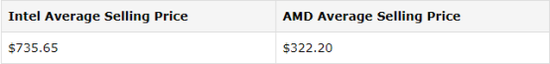 如上图所示,英特尔的产品平均售价高出228%。虽然AMD的低价开始是为了进入英特尔控制的CPU市场的需要,但现在它已经成为公司的竞争优势,也是其单位市场份额大幅增长的主要原因。这种定价差异也解释了,尽管销量下滑,英特尔仍设法保住了很大一部分收入份额。