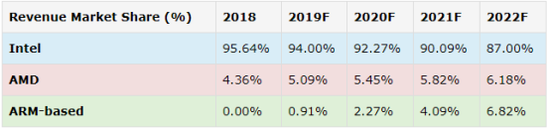 ARM的崛起将对英特尔的市场份额造成毁灭性的打击。如上所述,英特尔的单位市场份额预计在未来四年将下降20%,至71.40%。同样,由于英特尔的价格较高,这也有一定的误导性。在相同的收入市场份额图表中,英特尔仍将保持87%的市场份额。然而,这仍然是一个显著的下降,并几乎削弱了其CPU收入的增长。
