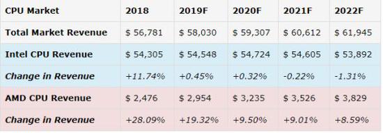 2019年,我们预计英特尔的收入将增长0.45%。这与2018年的11.74%相去甚远,当然要记住,2018年的增长主要是由于价格上涨。从2021年开始,随着基于ARM处理器的处理器开始加速发展,英特尔的CPU平台收入实际上将开始下降。另一方面,AMD明年的平台CPU销售仍有望实现两位数的增长,接下来的几年将实现个位数的高速增长。