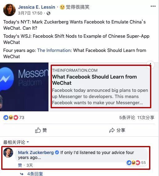 其实,早在四年前,美国科技媒体The Information的创始人Lession就撰写过一篇名为《脸书应该向微信学习什么》的文章。
