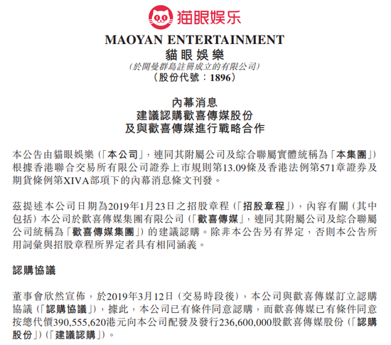 新浪港股讯 猫眼娱乐发布公告,于2019年3月12日,公司与欢喜传媒订立认购协议,据此,公司认购欢喜传媒2.366亿股欢喜传媒股份,总代价约3.91亿港元,认购价较于认购协议日期在联交所所报欢喜传媒收市价每股股份1.560港元溢价约5.81%。
