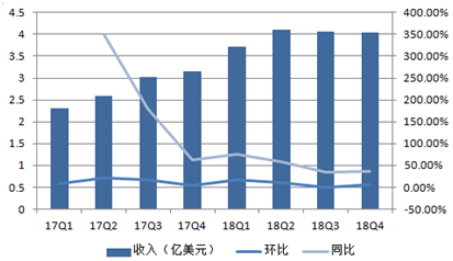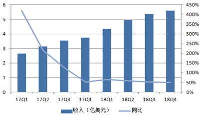 因此,增值业务收入的快速增长就显得尤为重要。2018年第四季度,公司增值业务收入达到7.224亿元,同比增长272%,这是该业务连续2个季度保持200%以上的增长。2018年第三季度,增值业务收入约为5.65亿元,同比增长221%。