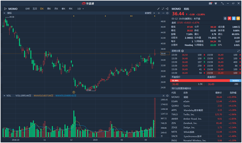 此前,华尔街16位分析师平均预计,陌陌2018年第四季度营收为5.3282亿美元,每股摊薄净利润为0.52美元。2018年四季度公司营收5.591亿美元,每股摊薄净利润为0.59美元,远超华尔街预期。公司股价昨晚也应声大涨11.95%,股价达到36.44美元。