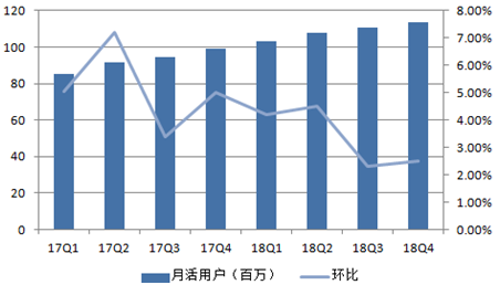 虽然直播业务为陌陌带来可观的营收,但对于公司用户增长和社交地位来看意义不大。公司用户规模增速已经开始下滑,自2017年第二季度,用户环比增速达到最高的7.2%后,就开始震荡下滑,2018年第四季度增速已经降至2.5%。