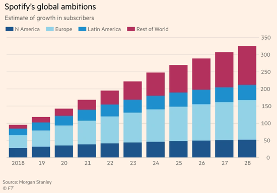 Spotify面临着快速增加用户的压力;苹果最近取代Spotify,成为美国最大的付费音乐流媒体服务提供商。美国是全球最大的音乐市场。但Spotify仍是音乐流媒体领域遥遥领先的全球领导者,截至2018年底,该公司在全球拥有8700万付费客户。