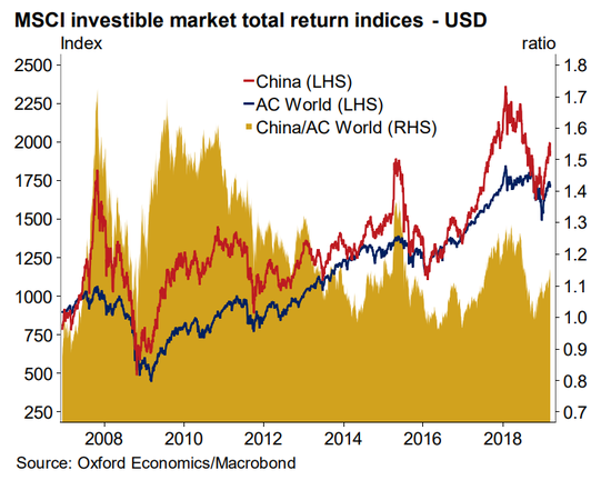 自去年10月中旬以来,摩根士丹利资本国际中国指数(MSCI China Index)的表现一直好于摩根士丹利资本国际全球指数(MSCI All Country World Index)。尽管如此,在截至10月份的几个月里,由于美国股市在去年减税后表现强劲,以及市场对贸易紧张局势的担忧,中国股指表现不佳。