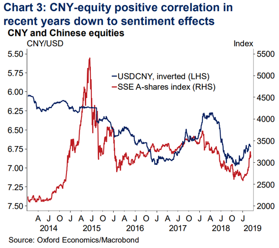 到目前为止,随着对货币和股票的需求都有所增加,人民币的走势与中国股市的上涨正相关。下图突出显示了股票和人民币之间正在形成的正相关关系,这意味着资产往往在同一时间朝着同一方向移动。