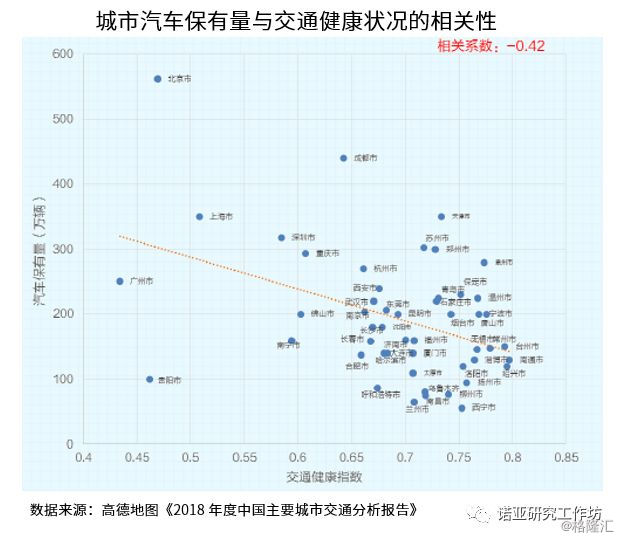 高德地图发布的《2018年度中国主要城市交通分析报告》中就有一张图完美的呈现了当前我国汽车保有量与主要城市交通健康之间的关系: