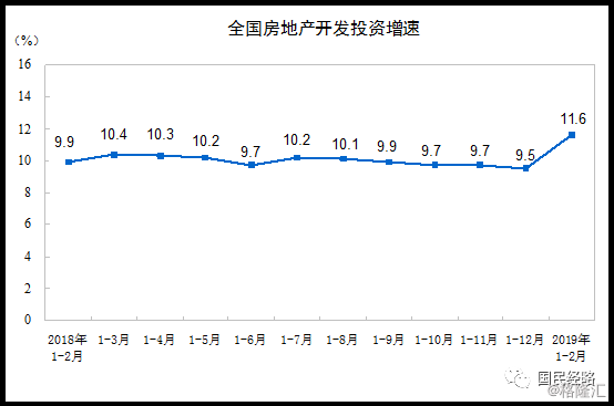 2019年1-2月,全国房地产开发投资同比增长11.6%,而去年全年增长9.5%,增速提升2.1个百分点。