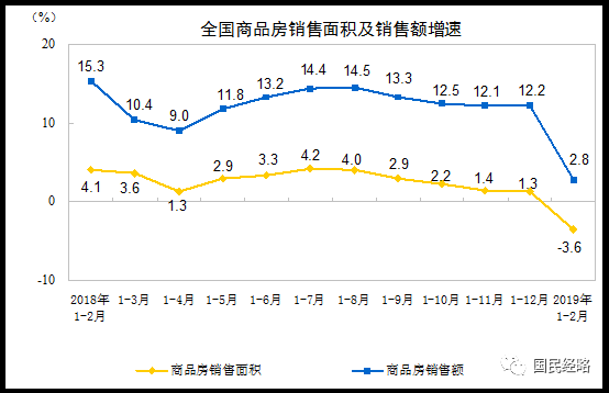 2019年1-2月,商品房销售面积14102万平方米,同比下降3.6%,2018年全年为增长1.3%;