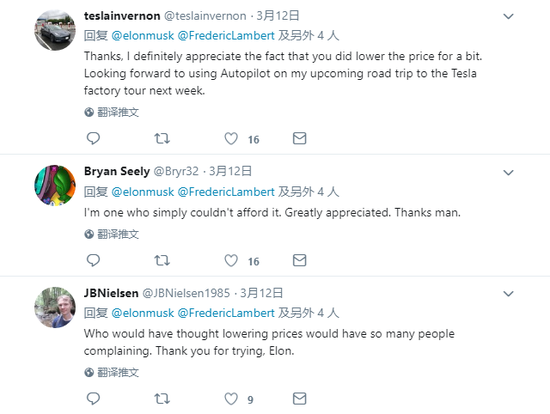 首先,那些买不起特斯拉的潜在车主就觉得,马斯克决定降价是为了自己这些人考虑,对马斯克表示感谢。截图中最后这位还表示同情马斯克的遭遇,“谁又能想到降价反而引发这么多人抱怨呢?感谢你的尝试,埃隆。”