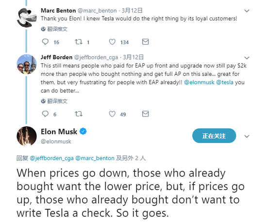 3月12日,马斯克在推特回应网友时就吐了苦水表示无奈:“我们降价吧,已经买了的人想要享受降了之后的价格;但是如果我们涨价呢,也没见哪个买了的想给特斯拉写张支票补齐差价。就这样吧。”