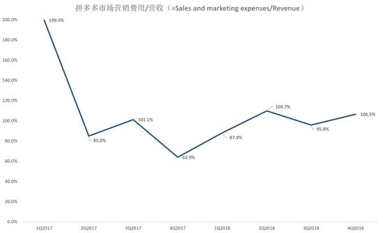 粗略估算(因为拼多多的用户数是非自然年的年度数据),拼多多2018Q4新增用户3300万人,比Q3的4200万人已有所下降,Q4的获客成本更是飙升,达到182.5元,环比增138%。这还是在花费了60亿元市场营销费用下取得的。