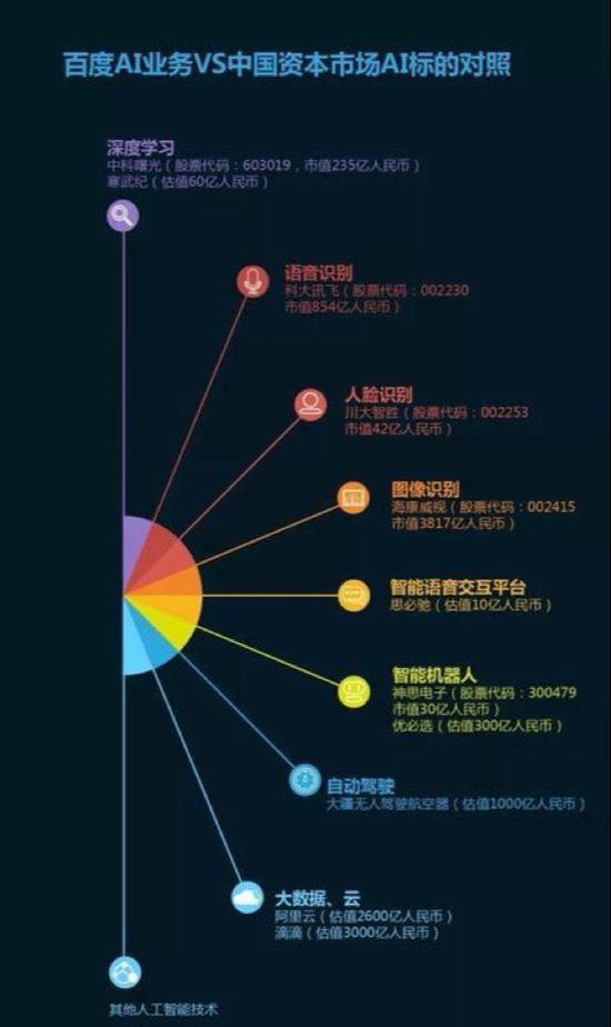 从资本市场估值的角度来看,百度在AI领域的多项应用成果都有成熟的对标公司,像人脸识别、图像识别等AI视觉方向的技术研发与应用,商汤科技、Face++的估值都已超过30亿美元,而在二级市场也有海康威视这样3237亿人民币市值的巨无霸,单单人脸识别这一项技术也能够支撑像川大智胜这样38亿人民币市值的公司。