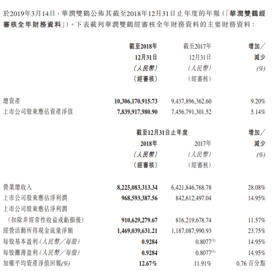 新浪港股讯 华润医药发布公告,2018年,附属华润双鹤实现营业总收入82.25亿元人民币,同比增长28.08%;上市公司股东应占净利润9.68亿元,同比增长14.95%;基本每股收益0.9284元;拟派现金股息每10股人民币2.79元。