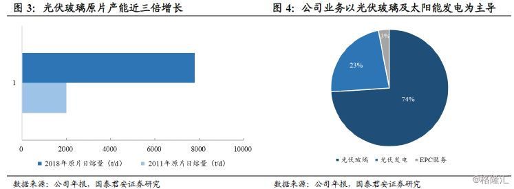 公司上市后光伏玻璃及电站业务迅速发展,收入及利润逐年增长。我们测算公司2013-17收入及归母净利年均复合增速分别达48%、66%,一方面,光伏玻璃产能近三倍增长:上市伊始日熔量仅2000t/d(4条),2018年末产线已达7800t/d(10条);另一方面,公司2014年仅在安徽芜湖并网250MW(地面电站),而2018年中报披露公司大型地面电站并网规模已达1934MW,电站分布于安徽、天津、湖北等中东部地区。以2018中报营收口径测算,光伏玻璃、光伏发电及EPC服务分占74%、23%、3%。