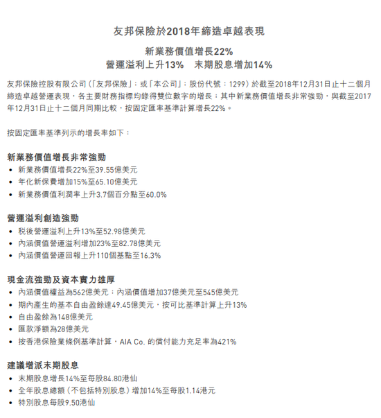 2018年,新业务价值增长22%至39.55亿美元;年化新保费增加15%至65.10亿美元;新业务价值利润率上升3.7个百分点至60.0%。