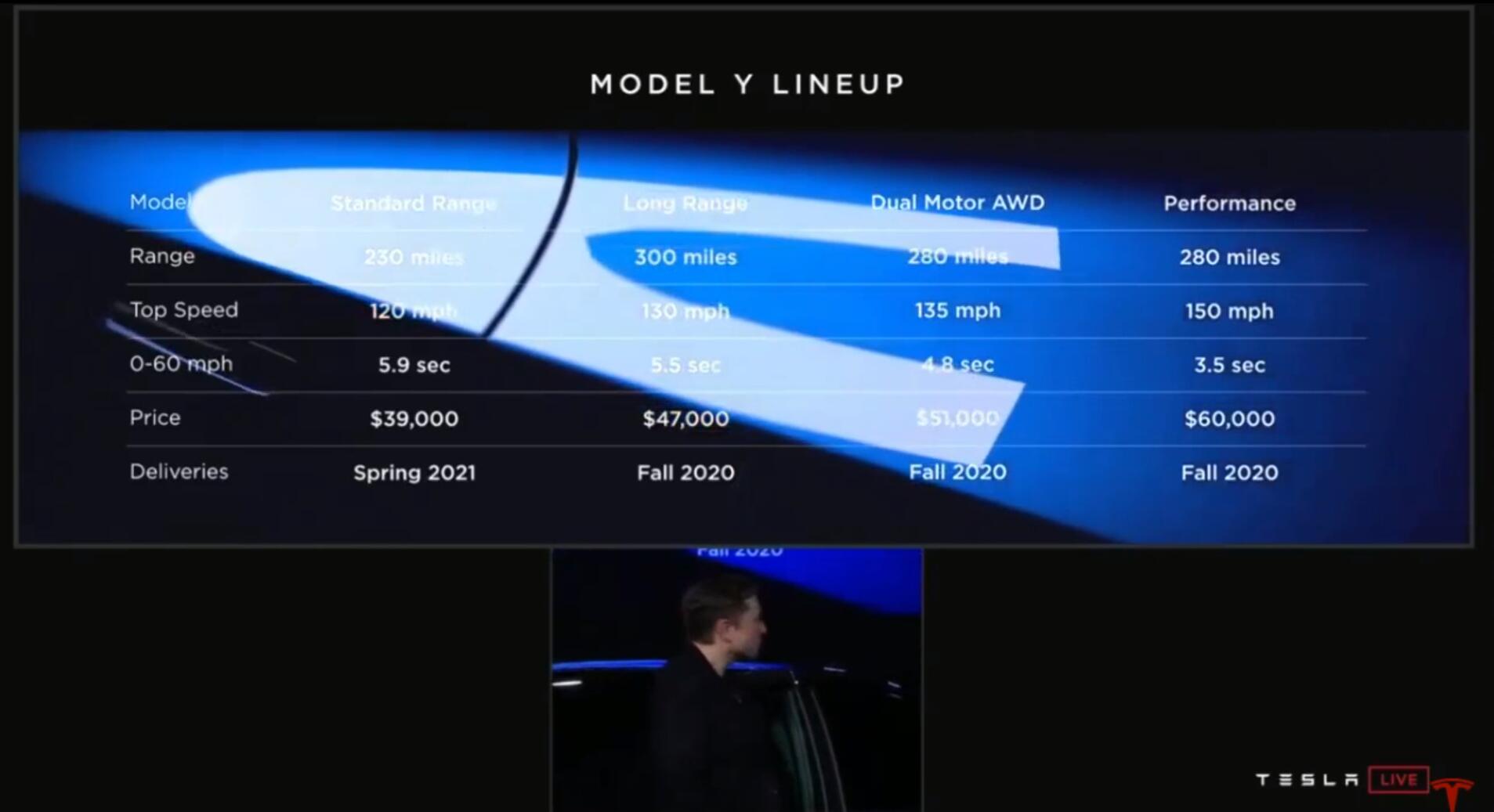 马斯克称,Model Y电池组比较低,底盘很稳,可实现3.5秒加速到60迈,续航里程有300英里。通过了美国安全测试, “是同等SUV中最安全的”。