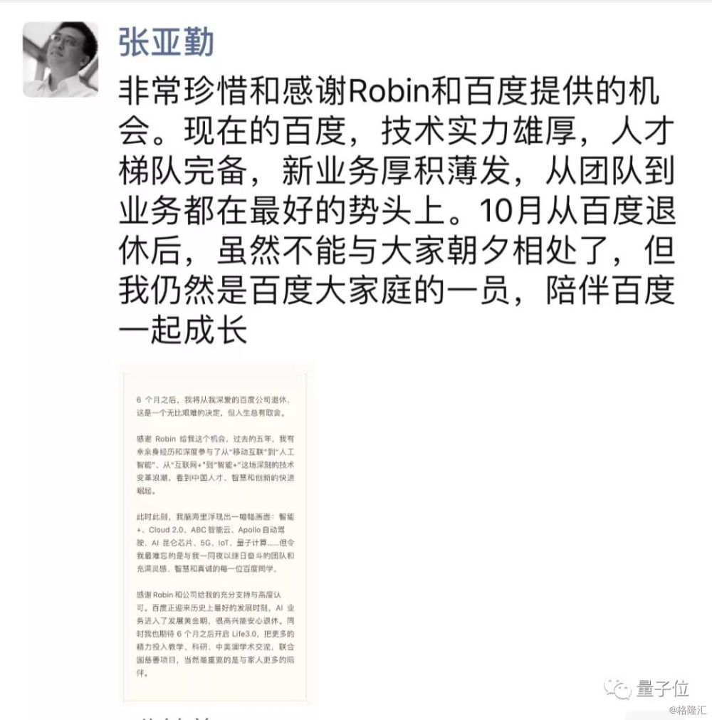 在过去几年间,亚勤和家人不在一个城市,陪伴的时间很少,在多年投入地工作之后,他希望可以更多地和家人在一起。在此我们理解并同意亚勤的选择,感谢他过去的辛勤奉献,并祝福他未来生活美好、身体健康、阖家幸福。亚勤永远都是百度大家庭的一员!我也想借此机会,感谢所有辛苦付出、做出贡献的百度同学,感谢每一位曾经在百度公司工作过的同事。