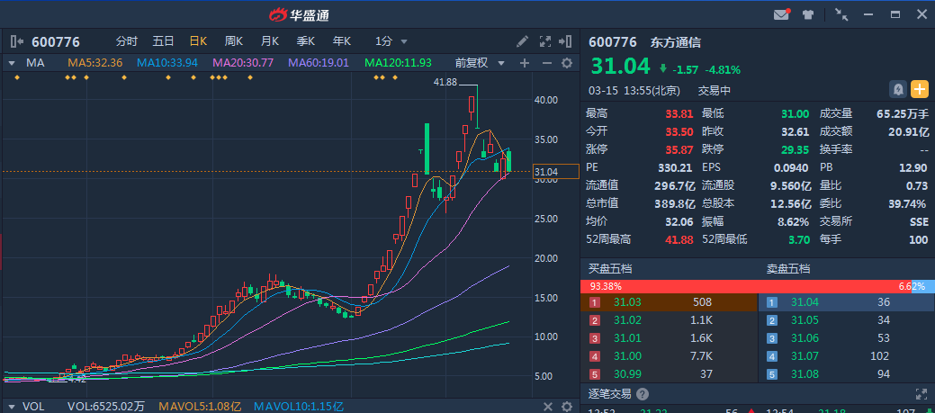心想:如果在最低点,3.7买入,最高点41块卖出,短短4个月,十倍,那确实有可能一夜暴富嘛,没错,这就是最近很火的东方通信。