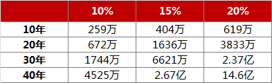 下面来感受一下复利的威力:100万起始金额,年化收益率10%,15%,20% 的最终结果 :