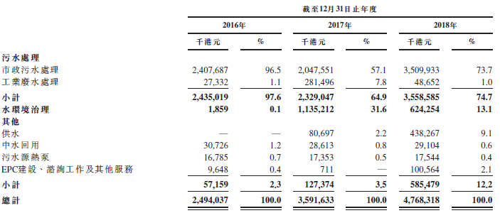 公司主要在环渤海经济圈及长三角开展业务,业务主要包括:污水处理(市政污水/工业废水处理)、水环境治理(河道河网/海绵城市等)及其他业务(主要包括供水、中水回用、污水源热泵及EPC建设咨询服务),收入主要来源于污水处理和水环境治理,前者报告期收入分别占公司总收入的97.6%、64.9%、74.7%,水环境治理业务于2016年开推出,占比从此前 的0.1%提至13.1%。