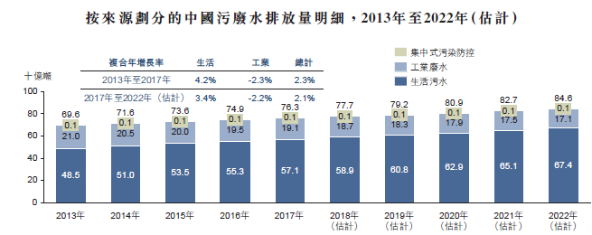 国内部分区域水资源短缺,加上城镇化增长带来水污染等一系列问题,国家通过完善立法、制定多项激励政策 (公私合营PPP,完善融资渠道)来推动水务行业发展,最主要的污水处理业务,预计2017年至2022年污水排放量年复合增速将达3.4%,其中农村污水处理率处于低位,相比城镇而言增长潜力巨大。