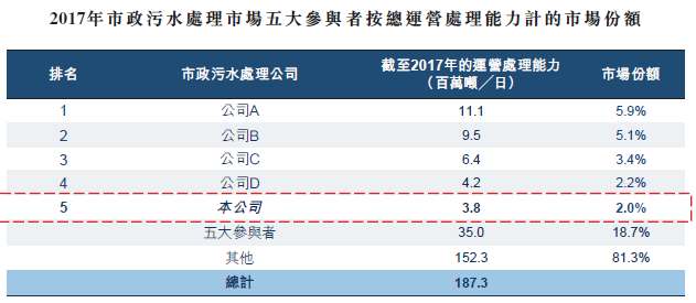 中国市政污水处理市场高度分散,且竞争激烈,前五大参与者处理能力占18.7%的份额。公司每日市政污水运营处理能力为380万吨/日,份额2%,排名第五,是排名第一企业处理能力的1/4。