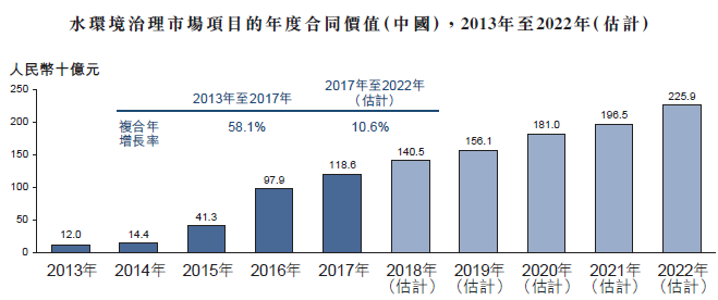 水环境治理项目因高资本投入要求,大量项目以PPP模式实施。14年引入PPP模式以来,资本注入带动水环境治理订单的高速增长, 2013年至2017年项目合同价值年复合增长率高达58.1%,之后到2022年的5年增速仍高达10.6%。