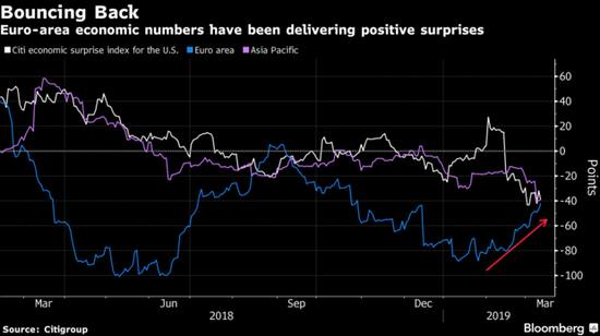 IHS Markit的全球增长指标在2月份从28个月以来的低点有所上升,令人鼓舞的是,需求指标有所改善。2月份,该公司对全球服务的衡量也出现三个月来的首次回升。花旗集团的欧元区意外指数已反弹至近5个月来的最高水平。欧元区一直是全球经济的薄弱环节之一。