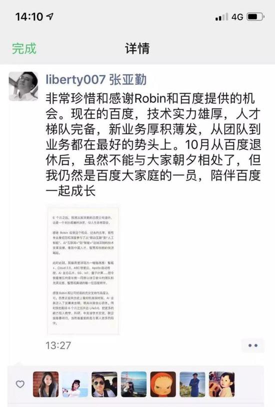 当天下午,周天财经目睹了张亚勤发布朋友圈证实,其六个月之后将从百度正式退休,‘这是一个无比艰难的决定,但人生总有取舍。’张亚勤称,他将在6个月后开启Life3.0,把更多精力投入教学、科研、中美澳学术交流,联合国慈善等项目,同时将生活重心转移到家庭上来。