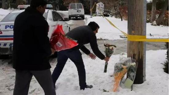 悼念者在谢尔曼家门前