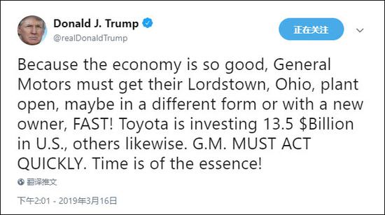 特朗普16日发推称,“经济形势一片大好,通用汽车必须让俄亥俄州的洛兹敦工厂开张,可能是以不同的形式开张,也可能有新的所有人,赶紧!丰田正在美国投资135亿美元,其他公司也是如此。通用必须赶快行动起来。时间至关重要!”
