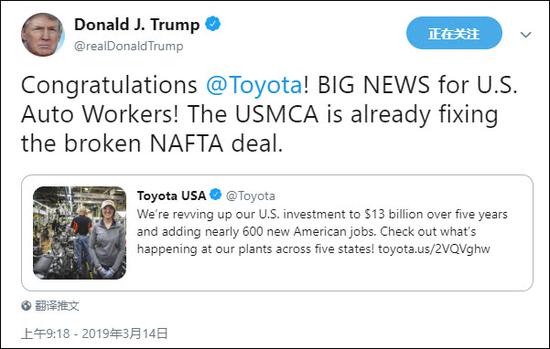 当天,特朗普在推特表示欢迎,“恭喜丰田。对美国汽车产业工人来说是重大新闻。美加墨贸易协定已经修正了破旧的北美自由贸易协定。”