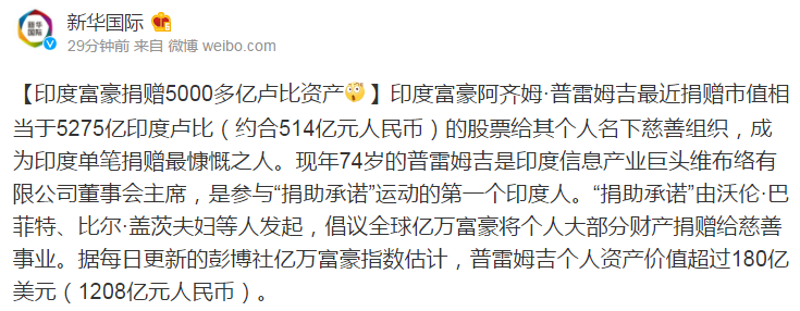 印度富豪阿齐姆·普雷姆吉最近捐赠市值相当于5275亿印度卢比(约合514亿元人民币)的股票给其个人名下慈善组织,成为印度单笔捐赠最慷慨之人。现年74岁的普雷姆吉是印度信息产业巨头维布络有限公司董事会主席,是参与“捐助承诺”运动的第一个印度人。“捐助承诺”由沃伦·巴菲特、比尔·盖茨夫妇等人发起,倡议全球亿万富豪将个人大部分财产捐赠给慈善事业。据每日更新的彭博社亿万富豪指数估计,普雷姆吉个人资产价值超过180亿美元(1208亿元人民币)。