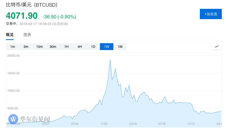 自2017年12月逼近2万美元创历史新高之后,去年比特币一路下跌,全年累跌70%以上,熊市已经持续15个月。今年以来,比特币价格波动不大,基本在4000美元以下徘徊。