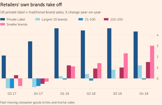尼尔森的数据显示,2018年最后三个月,美国商店所谓的自有品牌食品和饮料、化妆品及其它消费品的销量增长4.3%。相比之下,前20大品牌的销售额仅微幅增长1.2%。自有品牌的日益流行,正在动摇人们对老牌品牌价值的旧有确定性。