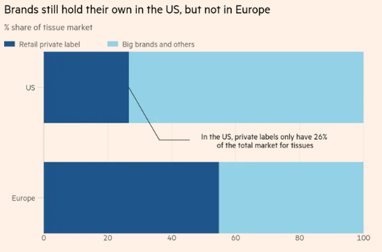 尽管最近增长迅速,但迄今为止,美国的自有品牌产品吸引的消费者数量仍低于欧洲。例如,欧睿信息咨询的数据显示,在纸巾领域,零售商品牌在美国仅占27%的市场份额,而在大西洋彼岸,这一比例为55%。欧睿研究分析师鲍勃-霍勒(Bob Hoyler)表示:“这在一定程度上与美国是资本主义的心脏有关。”“回溯几代人,家庭对特定品牌的偏好真的很强。”