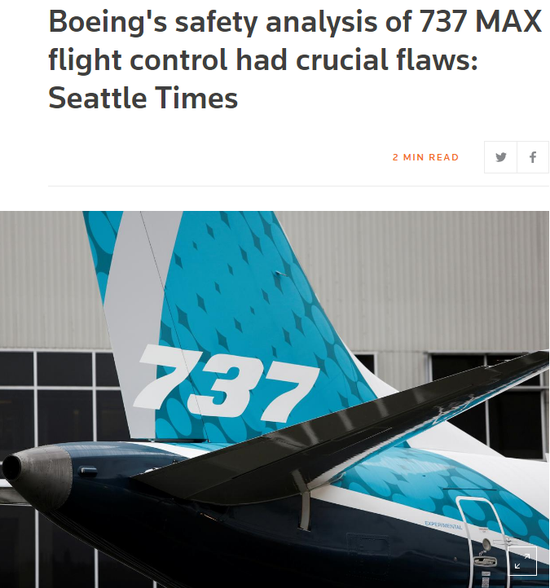 据路透社援引《西雅图时报》周日报道,波音公司对737 MAX客机新飞行控制系统的安全分析存在几个关键缺陷。