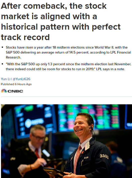 “标普500指数自去年11月中期选举以来仅上涨1.3%,股市在2019年仍有上涨空间,” LPL的Ryan Detrick周三在报告中称。经过本周的涨势,股市已从去年12月的大跌中反弹,标准普尔500指数今年迄今已上涨逾12%。