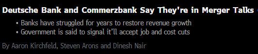 德国最大的两家银行德意志银行(Deutsche Bank)和德国商业银行(Commerzbank)上周日表示,它们已开始正式进行合并谈判。分析师认为,这是创建一家能够与美国投行巨头竞争的全国性冠军银行的最后努力。