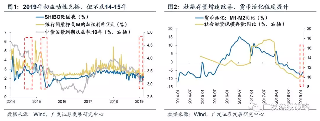 较为有利的是国内流动性环境较为充裕。市场流动性方面,年初以来银行间、债券市场资金充裕,不同期限的资金价格大体呈下行趋势;宏观流动性方面,社融存量增速企稳、货币活化程度改善,紧信用和去杠杆的担忧大为缓解。我们认为,国内流动性充裕驱使部分资金倾向于“南下”配置港股,但预计“溢出”体量较有限,个中缘由包括:其一,19年不是“大水漫灌”,流动性尚未泛滥;其二,国内“稳杠杆”和严控海外投资风险的背景下,“北水南下”的体量和配置渠道均受限。
