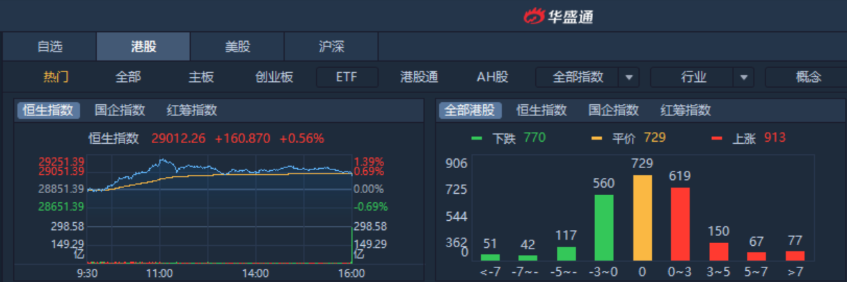 上周五,恒指早盘低开0.03%,收涨160.87点,涨幅0.56%,报29012.26点,全日成交额1214.55亿。国企指数涨0.53%,报11508.17点,红筹指数涨0.84%,报4550.96点。