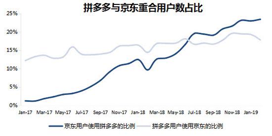 不仅如此,数据显示,拼多多正在分抢京东的用户。Questmobile公布的数据显示,拼多多与京东的重叠用户规模正在逐步扩大。重合用户中,越来越多的京东用户开始使用拼多多,且重合用户使用拼多多的时间和次数远高于京东。