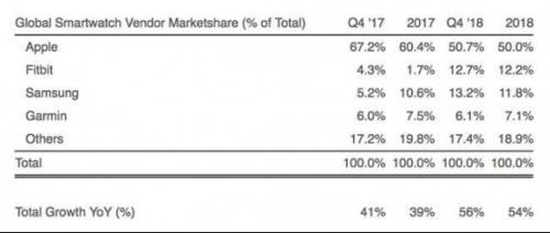 此外,另一家研究机构的调查数据,研究公司Strategy Analytics 统计称,2018年全球智能手表出货中苹果AppleWatch占据了全年51%的市场份额,出货量高达2250万台。同为智能手表老牌厂商的FitBit与Garmin,市场份额分别为12.2%和7.1%,下滑势头明显,三星则占据了11.8%。