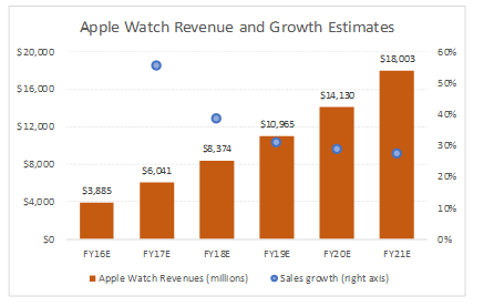 笔者预计公司手表销售2021财年将达到约10亿美元。市占率方面,原先预计到达波峰49%,且最终在2021财年回归仅44%的水平,当前数据超预期的情况下,笔者上调预期至47%。至于平均价格,未来几年预计会小幅提价,不过得注意竞争加剧、宏观经济增长放缓的影响。最后,调整后的智能手表销售预期如下。值得注意的是,2020财年预计约32亿美元的营收增量将约为为公司当年分析师一致营收预期增量的1/3,而当前其占总销售比例不到5%,可见未来的业务潜力很诱人。