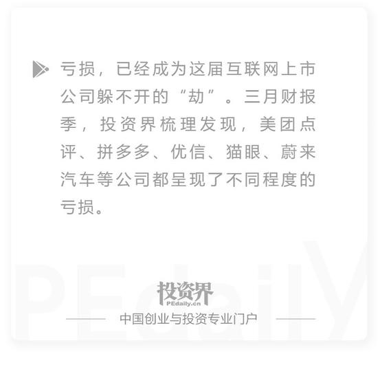 喧嚣褪去,甘苦自知。自3月开始,这一波初登资本市场的互联网巨头们纷纷发布财报。投资界梳理发现,美团点评、拼多多、优信、猫眼、蔚来汽车等公司都呈现了不同程度的亏损,而亏损金额动辄高达数十乃至百亿人民币,令人咋舌。