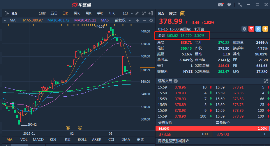 新浪美股 北京时间18日讯,波音美股盘前大跌3.5%,此前媒体报道称,美国交通部正针对联邦航空局为波音737MAX出具批文一事展开调查。