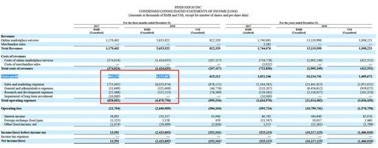 根据招股书披露的数据,2016年拼多多的销售和营销费用仅为1.69亿元,而2017年这一数字却增长到13.44亿元。最新的财报显示,拼多多2018年的销售和营销费用已经高达134.418亿元,年对年增长率接近10倍。