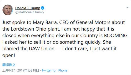 可能是前一条推特不管用,特朗普又发了两推,说自己不开心了:“刚刚和通用汽车公司的首席执行官玛丽·巴拉谈过俄亥俄洛兹敦工厂的情况。我不高兴,当我们国家的其他一切都在按计划进行时,它却关门了。我让她卖掉它或者快点做点什么。她却责怪美国汽车工人联合会——我不在乎,我只想让工厂开门!”